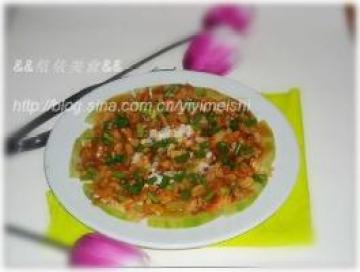 冬瓜500克,鱿鱼须50克,干贝适量,虾米适量,蚝油1汤匙,鸡精少量,生粉半个汤匙,葱花适量