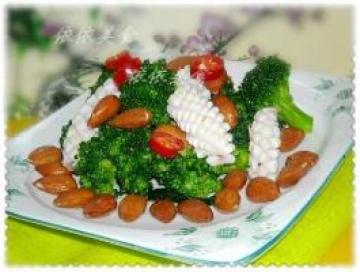 西蓝花1朵,鲜鱿鱼筒1个,杏仁50克,生姜几片,蒜头1瓣,盐适量,胡椒粉半个汤匙,白糖半汤匙,料酒1汤匙,生粉1小勺,鸡精1小勺,红辣椒半个