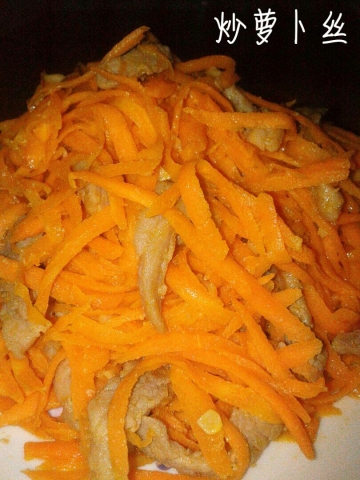 主料:红萝卜2根(约250g),猪瘦肉或鸡胸肉切幼条50g,蒜头1粒