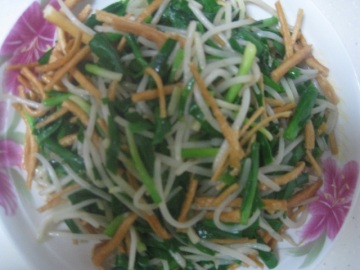 馓子一把 韭菜一把 绿豆芽一小袋 葱 蒜 香油 盐