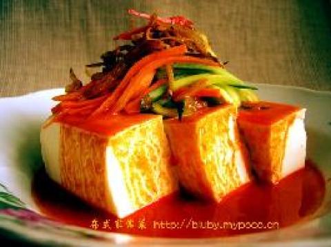 5.将豆腐摆入盘内,放上腌好的红萝卜丝和黄瓜丝及炒好的银鱼丝,顶部撒上几缕红椒丝做点缀,最后浇上香蒜辣酱汁,即可食用。