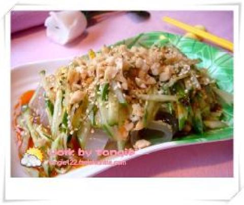 1.黄瓜切丝,拉皮切条,花生炸香后用刀背轧碎。