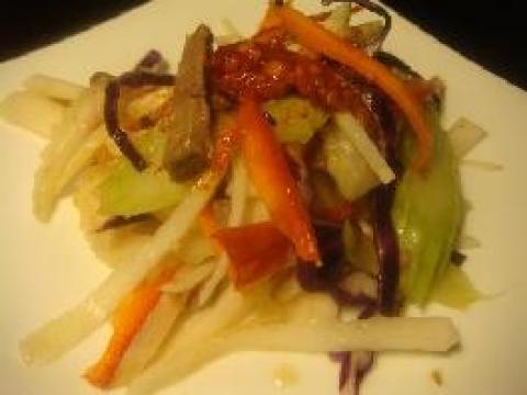 卤牛肉,西芹,红椒,竹笋,胡萝卜,紫甘篮菜,辣椒酱适量,普吉岛风味色拉汁