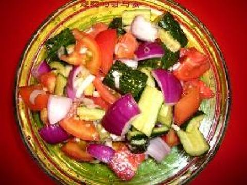 主料:小号番茄3个,小号黄瓜3根,紫皮洋葱半颗,葱