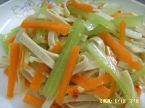 西芹3根,胡萝卜半颗,豆皮半张,蒜头,姜,油少许,盐,酱油少许,麻油,油辣椒