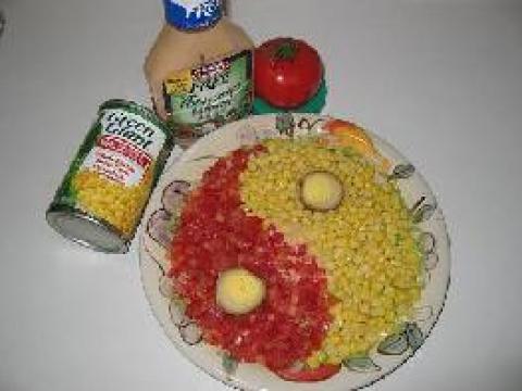 3.取一大盘均匀的铺上沙拉丝,再将西红柿粒和玉米粒摆成太极图的“s”型;