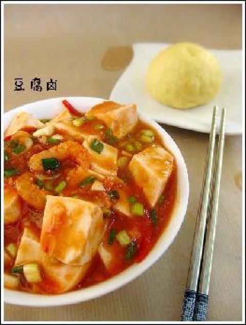 银祥嫩豆腐一块,西红柿一粒,虾皮和虾干若干,青葱若干,番茄酱少许,泰式甜辣酱少许