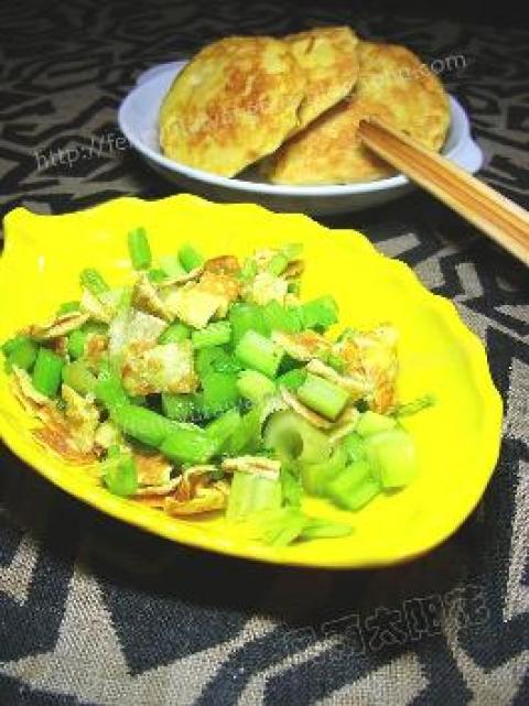 1.这个是早上喝粥用的小菜、蛋皮是煎馒头片剩下的蛋液,趁着平底锅的油摊好,切小块(这样显得多不是?)芹菜心切断,一起加少许盐调好即可。