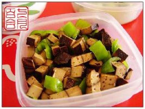 1.豆干切小丁,青辣椒切丁。