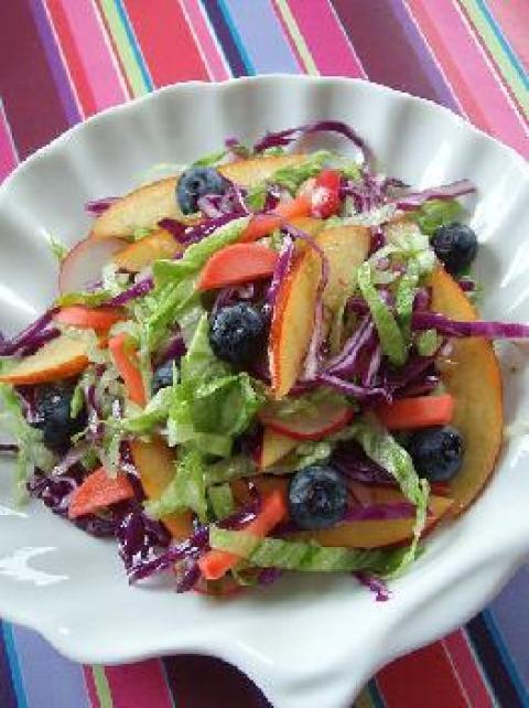 因为吃沙拉要的就是它的爽口和清新,所以尽量选用新鲜的材料,偶尔采用纯橄榄油、盐和黑胡椒代替普通沙拉酱,一定可以给你跟不一样的美味享受。 个人觉得,这款沙拉里的紫色甘蓝和酸甜樱桃萝卜是必不可少的,其他的你可以就地取材,比如把鲜黄桃换成苹果、橙肉都是可以的。