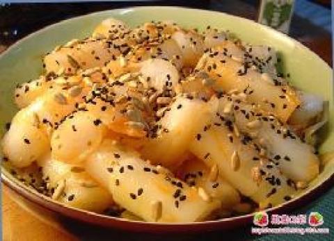 4.拌上辣酱、葵花籽仁、芝麻,成了一道美味。