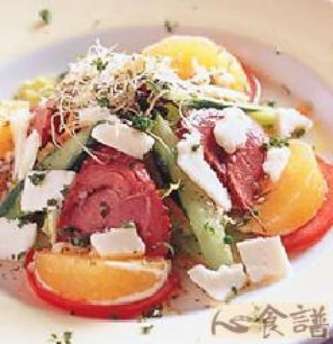 牛肉火腿片60g,红蕃茄1/4颗,萝蔓生菜40g,紫色高丽菜丝5g,小黄瓜片50g,红萝卜丝10g,香吉士1/2个,布瑞起士碎40g,酱汁:1/4茶匙,橄榄油3大匙,柠檬汁1茶匙,砂糖10g,盐适量,黑胡椒粗粉适量,蒜头碎8g,巴西里碎1/2茶匙