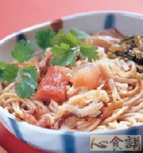 (2)泡面面条用热水沖泡约3分钟沥干放置餐盘上,淋上肉燥酱包即成干拌面。