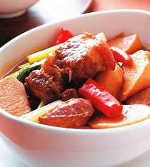 (3)取一锅子,先将五花肉放入,再倒入高昇排骨酱,用大火煮约15分钟入味,再翻面卤15分钟。