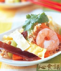 1.花枝与鲜虾洗净烫熟,花枝切成丝状;鲜虾去壳后也切成丝状备用。