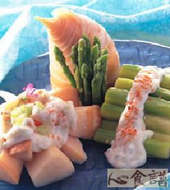 绿竹笋2支,芦笋200g,沙拉沾酱:20g,沙拉酱150g,芥末酱1大匙,熟芝麻粒1大匙