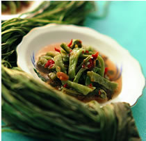 (2)将皇帝菜加入少许盐拌匀后,加入调味料及蒜末、辣椒末,搅拌均匀放约1 小时后即可入味(可放入冰箱),取出即可盛起食用。