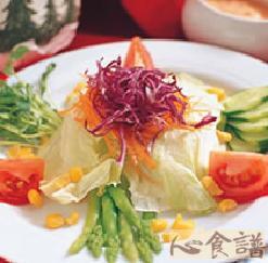 a.绿芦笋12只,蕃茄1颗,美生菜500g,小豆苖10g,小黄瓜1/2条,紫色高丽菜丝适量,胡萝卜丝少许,玉米粒2小匙,b.千岛酱6大匙