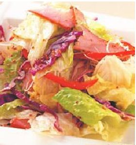 腌燻肉片30公克,西生菜50公克,苜蓿芽20公克,紫高丽菜15公克,红甜椒15公克,洋葱末20公克,芥末籽酱1大匙,盐1/8小匙,细砂糖1小匙,橄榄油1大匙,白酒醋2小匙