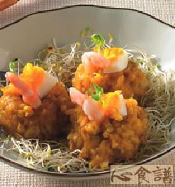4.取杂粮饭、作法2虾仁丁、作法3水煮蛋丁以及所有调味料搅拌均匀,挖成球状摆至作法3苜蓿芽上即可。