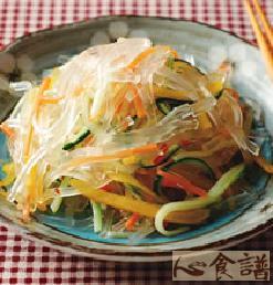 凉粉条50公克,小黄瓜5公克,红萝卜5公克,鲜黑木耳5公克,糖1小匙,香油1大匙,白醋1/2小匙,泰式鱼露2大匙