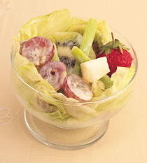 (5)将作法4的优格沙拉酱淋入混合好的蔬果中,小心搅拌均匀,放入冰箱冷藏(至少2小时)后,即可取出放在莴苣叶上一起食用。
