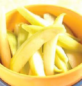 1.芒果洗净,削皮去核,切粗条,用盐抓揉至软后,充分洗去盐份。