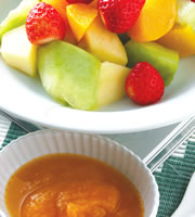 哈密瓜1/4颗,苹果1/4颗,罐头水蜜桃1/4颗,草莓10颗,南瓜沙拉酱适量