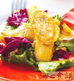 香蕉120公克,莴苣150公克,鸡蛋1颗,中筋面粉20公克,橄榄油20㏄,橙汁油醋酱2大匙