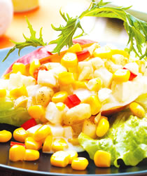 甜玉米粒50公克,苹果1颗,西芹丁20公克,核桃碎10公克,莴苣100公克,美乃滋20公克,盐适量,胡椒粉适量