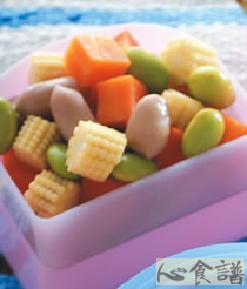 3.将作法2玉米笋段、红萝卜丁、毛豆仁以及熟花生仁加入所有调味料拌匀即可。