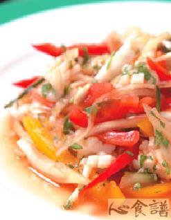 透抽1只,红蕃茄1颗,红甜椒1/4个,黄甜椒1/4个,洋葱1/8个,大黄瓜1/8条,野姜花10朵,调味料:少许,柠檬汁2大匙,蕃茄酱2大匙,白醋1大匙,砂糖2大匙