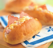 (4)烤焙出炉后待冷却,取1个烤好的面包,从中心割开,将火腿丁、玉米粒混和美奶滋后取适量填入面包中,夹入斜角对切的2片火腿片即完成。