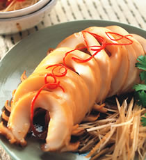 1.烧热1锅水,放入花枝、米酒、姜片,将花枝汆烫去腥后,取出沖冷水至凉备用。
