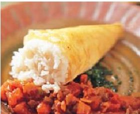 2.蛋打散,与中筋面粉拌匀,放入热油锅,用小火煎成蛋皮,将作法1的饭包成锥状。