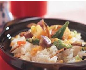 美国长米80公克,绿豆仁50公克,小鱼干10公克,小蕃茄2颗,马铃薯50公克,茄子50公克,秋葵2条,白胡椒粉少许,鱼露1茶匙,蚝油1茶匙,鸡高汤250㏄