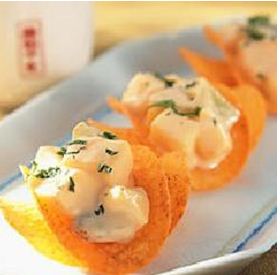 2.将作法1中拌入沙拉酱,放在洋芋片上。