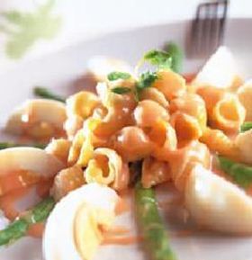 义大利贝壳面60g,芦笋8根,蛋2颗,蕃茄酱2汤匙,白胡椒粉少许,盐少许,美乃滋100g,水果醋3茶匙,橄榄油28g