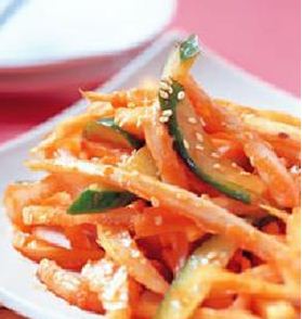 桔梗200公克,小黄瓜1/2根,芝麻1小匙,辣椒酱2大匙,醋2大匙,糖2大匙,辣椒粉1小匙,酱油1小匙,麻油1小匙