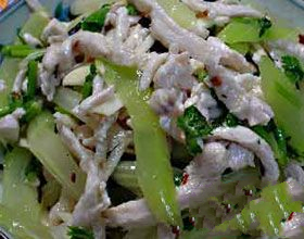 2、芹菜择去根、叶,洗净,放入开水中烫透捞出,晾凉,斜切成细丝,拌入肉丝内,加入精盐、味精拌匀。