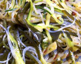 2.泡发的海带洗净,用开水烫过,放凉切成细丝。也可以在超市购买现成的海带丝。
