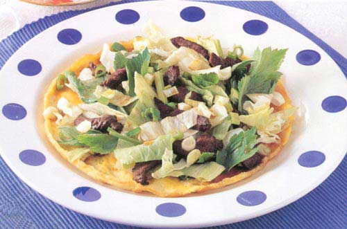 3、平底锅中倒入c料烧热,放入牛肉以大火炒至变色,加入d料及1大匙水煮开,盛入蔬菜碗中搅拌均匀,倒在蛋皮上,撒上葱末,即可盛出。