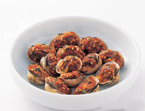 (1)把蛤蜊洗净并泡在盐水里使之吐出于泥,放进开水里壳开时捞取放凉。留沾有蛤蜊肉的那一边壳,另一边壳去掉。使蛤蜊的肉向上摆在碟子上。