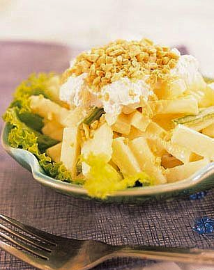 主料:苹果400克,芹菜段100克,腰果100克,鲜奶油20克,沙拉酱10克,生菜50克,柠檬半个,盐适量。