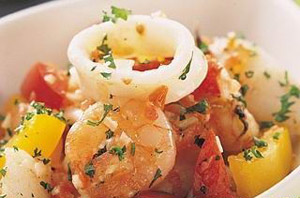 主料:中卷墨鱼1只,虾仁110克,蟹腿肉110克,鲜贝110克,三色甜椒各1/2个。