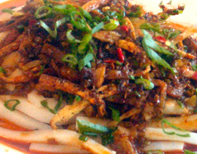 2.凉粉切宽丝,淋上炒好的五花绞肉和拌匀的调味料(色拉油、豆瓣辣酱、酱油、白糖、榨菜末、大葱、大蒜、辣椒油),食前全部拌匀即可。
