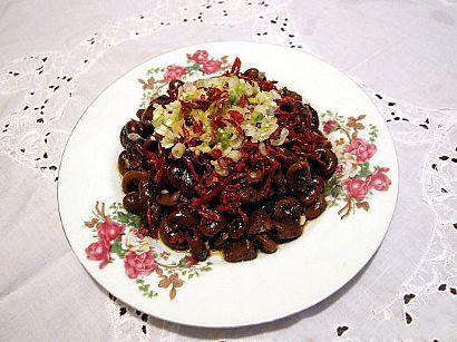 5辣椒切丝后放入小碗中加水浸泡5分钟后捞起(用水浸泡后的辣椒油炸时不糊切颜色红亮),再将铁锅烧热放入香油,烧至7成时放入备好的辣椒丝,带有辣香味时起锅,待用;