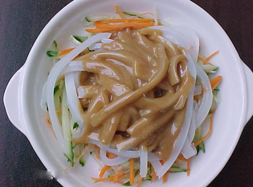 主料:粉皮100克,黄瓜,红萝卜各50克,芝麻酱适量。