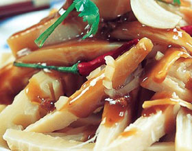 3.用香油、干辣椒、酱油、糖、味精调成汁,拌入笋条中即成。