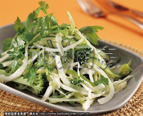 6、将卷心菜细丝、香芹段、小黄瓜丝、洋葱丝、西兰花小朵放入大碗中,再调入调味汁,搅拌均匀即可。